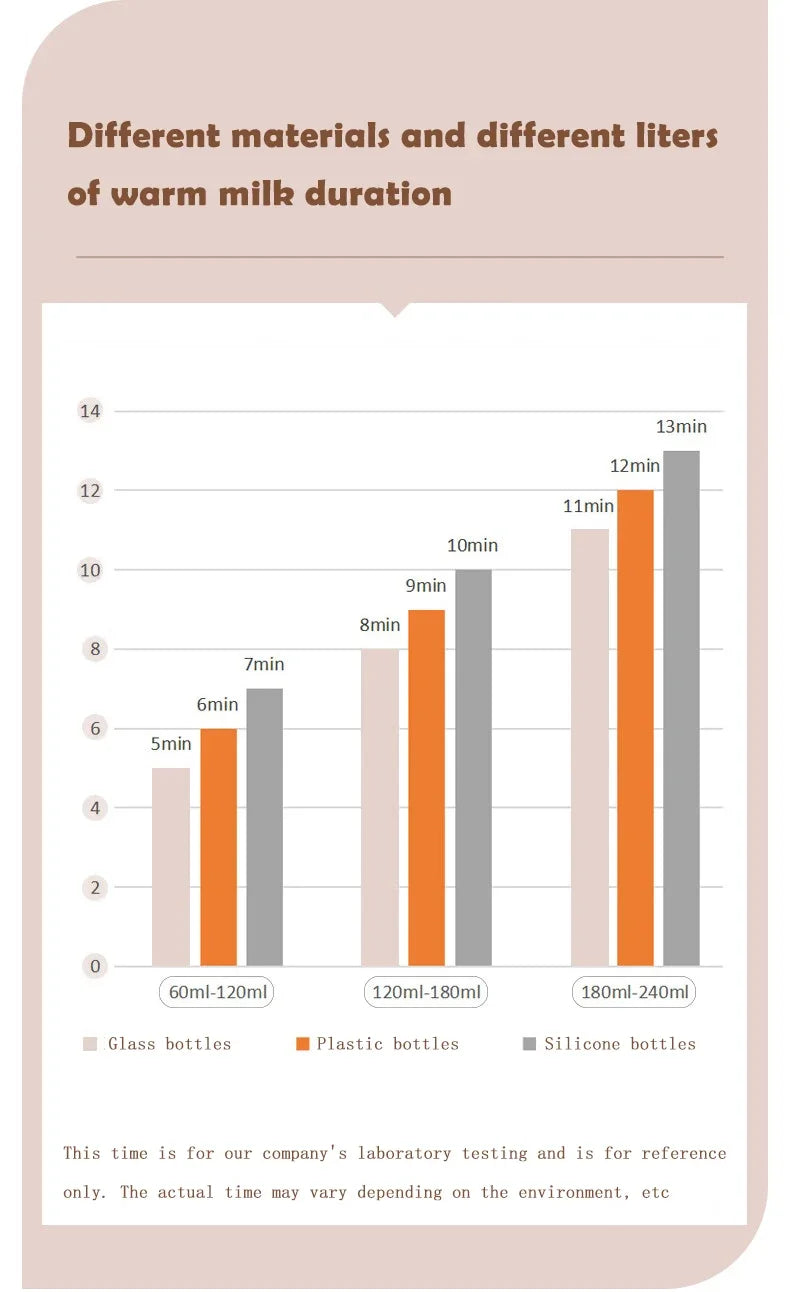 4. Precise temperature control. Accurate temperature control is more reassuring, restoring the temperature of breast milk. 45 degrees Celsius water quickly heats up the milk, and due to the insulation transmission caused by the bottle nose, the temperature decreases. The warm milk temperature is just right, caring for the baby's delicate intestines and stomach.