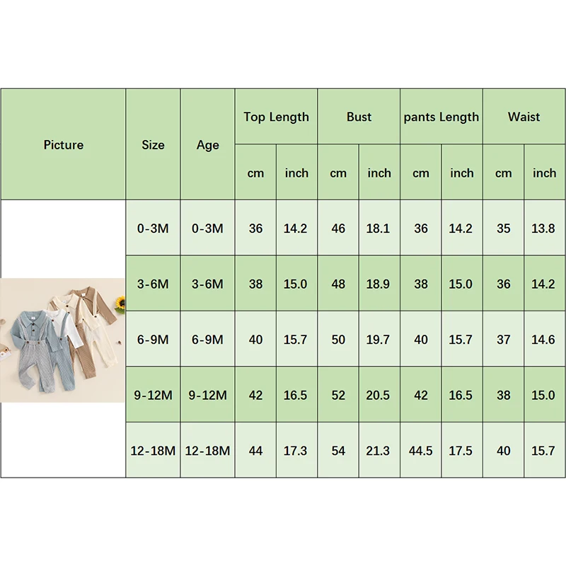 3-6M Romper Length: 14.96 Bust: 18.9 Pants Length: 14.96 Waist: 14.17 Advised Age: 3-6 Months