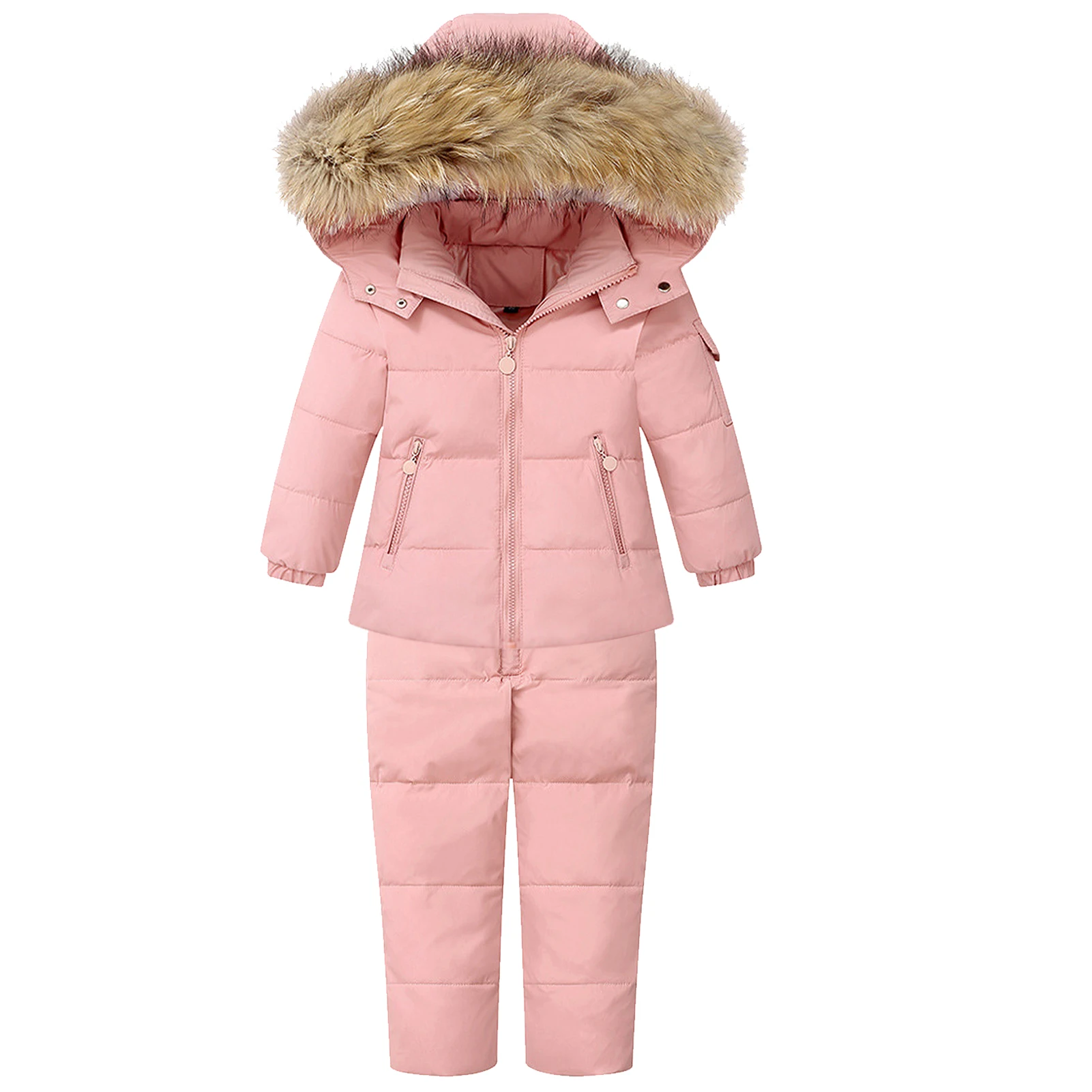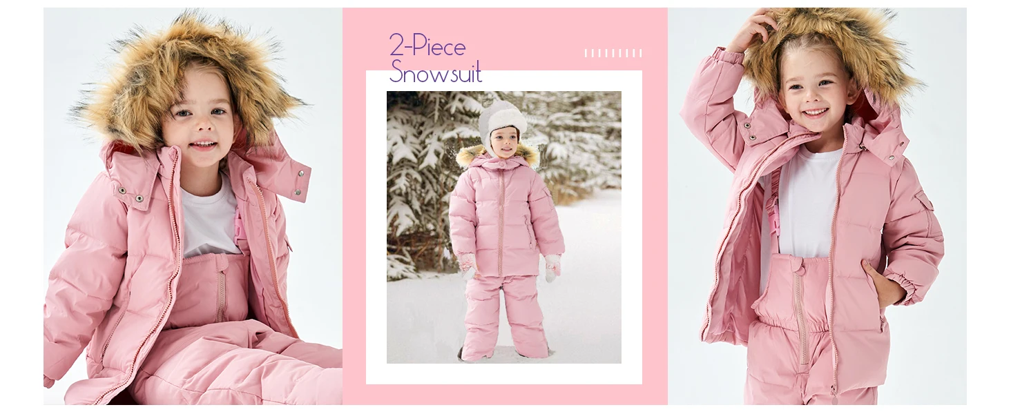 🍇DESIGN: Trendy design of baby girl winter snowsuit, detachable down hood and artificial fur collar for better keeping your head warm. 2 Pockets on the baby down jacket provides great convenience for storage. The straps of kids winter pants can be easily adjusted in length, and with elastic cuffs of the trousers, which can effectively resist cold wind.