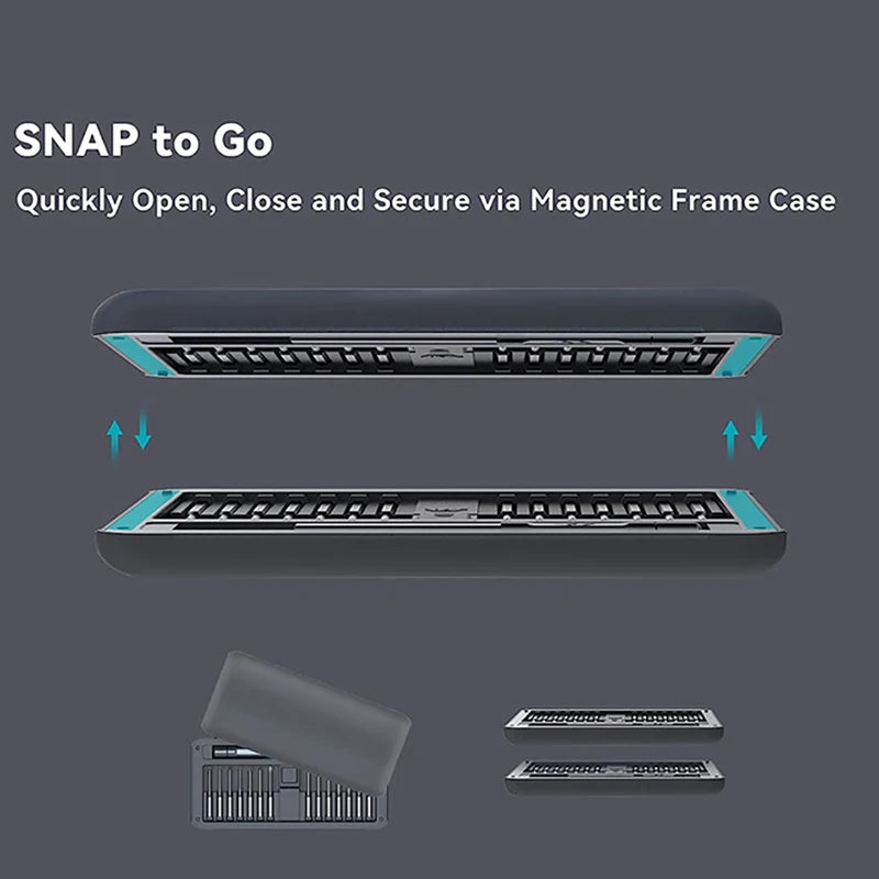This sets are kept in magnetic storage case. This keeps them secure and clean and means that they are clearly arranged for easy tool selection. Each part has a snug-fitting storage slot in the carrying case making portability and accessibility a cinch. Compact and lightweight design.