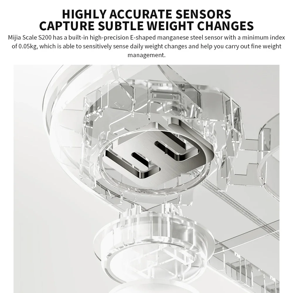 Mijia Scale S200 has a built-in high-precision E-shaped manganese steel sensor with a minimum index of 0.05kg, which is able to sensitively sense daily weight changes and help you carry out fine weight management.